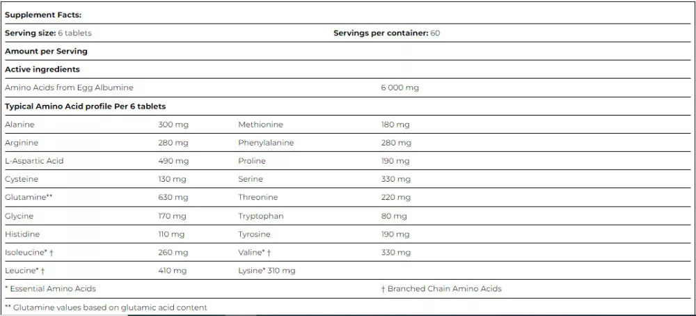 Az Egg Amino 6000 egy speciális aminosav-kiegészítő, amely 1000 mg tiszta tojásalbumint tartalmaz tablettánként. A tojásfehérje egyedülálló profilú aminosavak kiváló forrása.