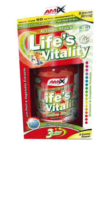 Az Amix Life’s Vitality az egyik legkomplettebb tablettás formula, mely biztosítja a szervezet számára az összes fontos vitamint, ásványi anyagot, valamint növényi- és egyéb összetevőket, kivonatokat. Továbbá olyan erőteljes antioxidánsokat tartalmaz, mint pl. zöld tea, szőlőmag, feketeszeder, és egyéb gyógynövények és enzimek hosszú sorát. Az Amix Life’s Vitality tablettáit egy speciális bevonattal láttuk el, mely kettős célt szolgál: megkönnyíti a lenyelést és megvédi a tablettában található értékes hatóanyagokat a gyomor savas közegétől. Az Amix Life’s Vitality egy tudományosan összeállított, komplex és erőteljes formula!