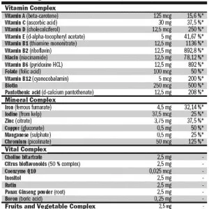 Folyékony formájú vitaminok és ásványi anyagok széles spektruma, gyümölcsök és zöldségek komplexével, valamint más létfontosságú összetevőkkel gazdagítva, mint például a Q10 koenzim, kolin, citrusfélék bioflavonoidjai, inozit, ginzeng és még sok más.