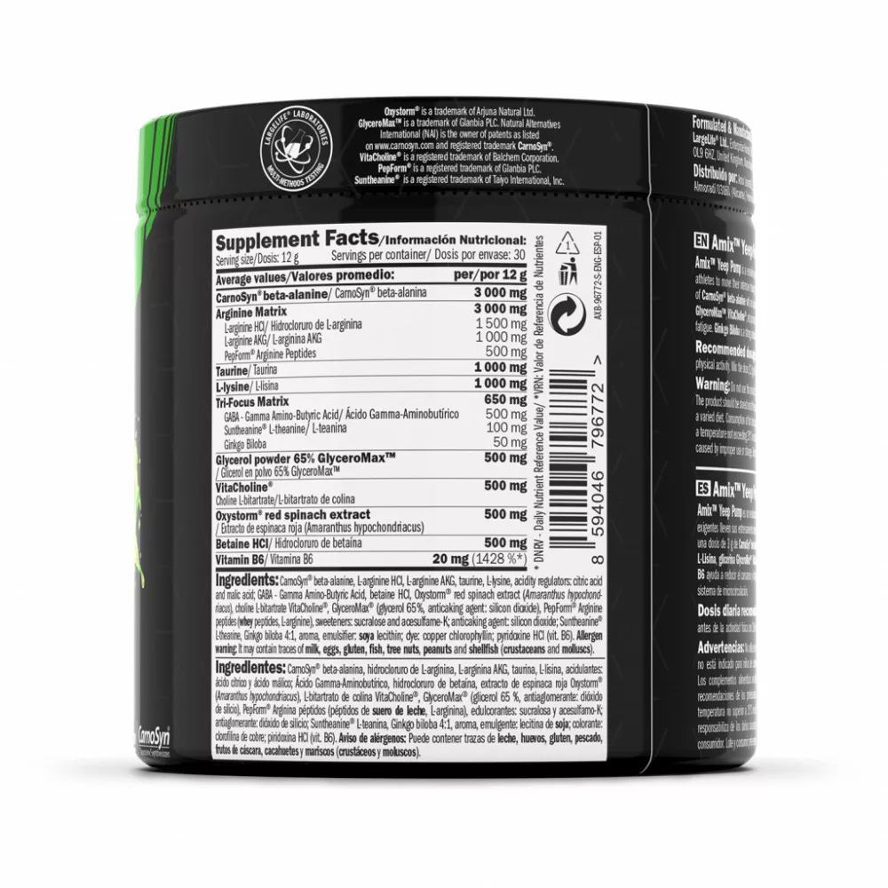 Az Amix™ Yeep Pump NO Caff egy forradalmi szuperkoncentrált edzés előtti stack, amelyet a legigényesebb sportolók számára terveztek, hogy intenzív edzéseiket magasabb szintre emeljék. Ez a frissítő és ízletes ital 3 g-os CarnoSyn® béta-alaninon alapul, Arginine Matrix, Tri-Focus Matrix, Taurin, L-Lizin, Glycerine GlyceroMaxTM, VitaCholine®, vörös spenót kivonat Oxystorm® és Betain infúzióval. A B6-vitamin segít csökkenteni a fáradtságot és a kimerültséget. A Ginkgo Biloba erős antioxidáns, és támogatja a vérkeringést.