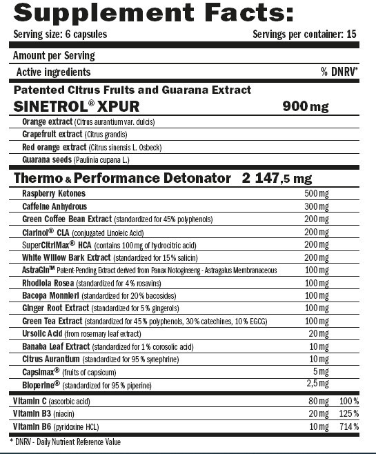 A MuscleCore® Detonatrol™ csak a legjobb minőségű, maximális szilárdságú és alaposan tanulmányozott összetevőket egyesíti, mint a Sinetrol®, Clarinol®, Super CitriMax®, AstraGin™, BioPerine® és sok más hatékony vegyület egy egyedi és könnyen használható formulában.