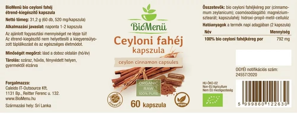 Összetevők: 100% bio fahéj (cinnamomum zeylanicum / verum); hidroxipropil-metilcellulóz alapú 00-ás méretű kapszula, 100% hipromellóz.