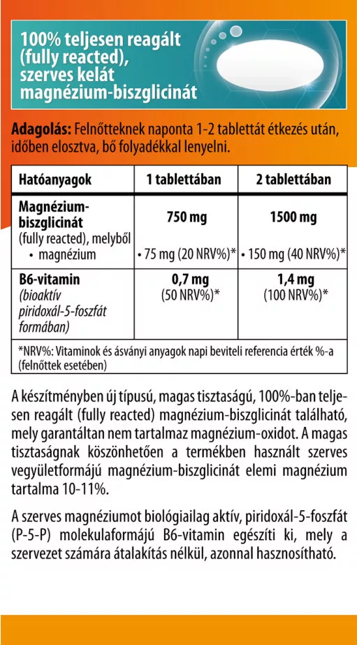 Magnézium-biszglicinát (fully reacted), melyből | 750 mg | 1500 mg |