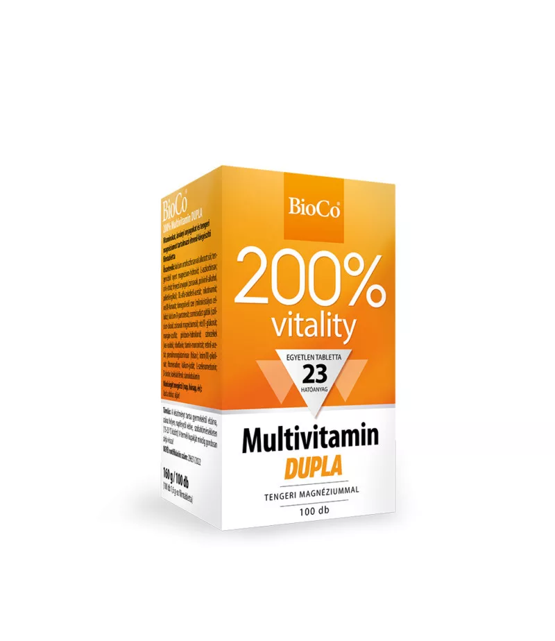 A BioCo® 200% Multivitamin DUPLA minden vitaminból 200%-ot tartalmaz, amely a felnőttek számára javasolt napi referenciaérték duplája. A 13 féle vitamint további 10 féle ásványi anyag egészíti ki, többségük szerves, a szervezet számára jól hasznosuló formában került a készítménybe.