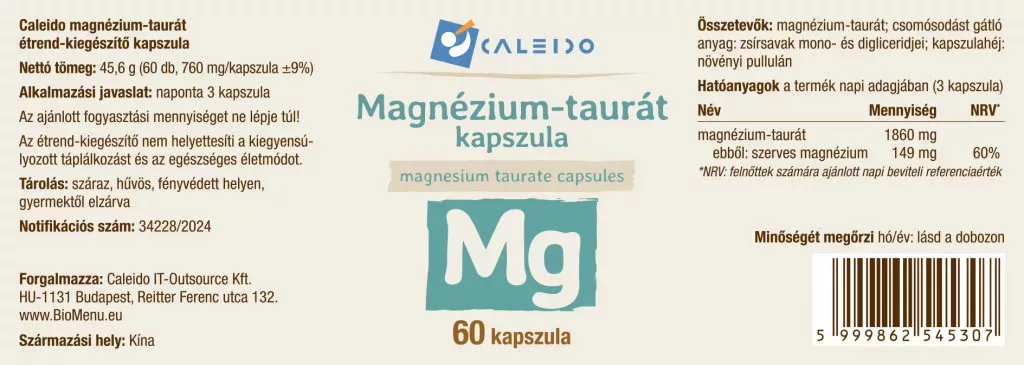 magnézium-taurát 1860 mg, ebből szerves magnézium 149 mg (NRV 60%)