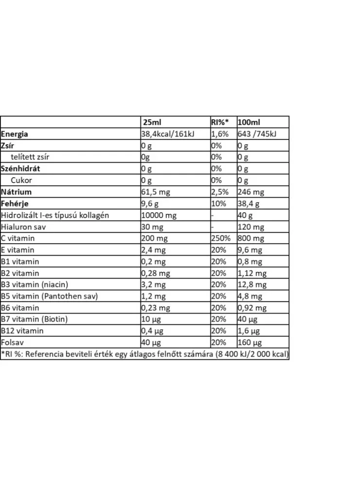 Sokszor találkoztunk olyan kérdésekkel, hogy a folyadék vagy a por a jobb. Nem értettük a kérdést, hiszen a port is feloldod valamilyen folyadékba mielőtt elfogyasztod, nem? A kész folyadék kényelmesebb. Ez biztos. Van-e hátránya? Igen. Felbontás után hűtőben kell tárolni. Ez az egy. Nincs több! A méltán népszerű 1-es típusú hidrolizált kollagént használtuk alapanyagul. Ehhez adtunk még adagonként 30mg hialuronsavat, 200mg c- vitamint, hogy segítse a kollagén felszívódást és hasznosulását, illetve egy kis vitamin mixet, mely tartalmaz egy B komplexet (B1, B2, B3, B5, B6, B7, B12), kis folsavat és egy kis E vitamint is. Ízekben álmodtunk, majd „varázsoltunk”. Így lett az egyik testvér Magic Berry, az erdei szamóca friss ízével, természetes aromával és színezékkel, illetve a másik testvér, Melon Dream, az üde sárgadinnye fantasztikus ízével, melyet egy csipetnyi mangóval fűszereztünk, hogy az íze még álomszerűbb legyen. Very cherry- édes meggy és Lime- Elderberry bodza- lime nyári hűsítő ízekkel pedig még nehezebbé tettük a választást. Tápanyag táblázat 1 adag: 25 ml (1 adagolókupak)