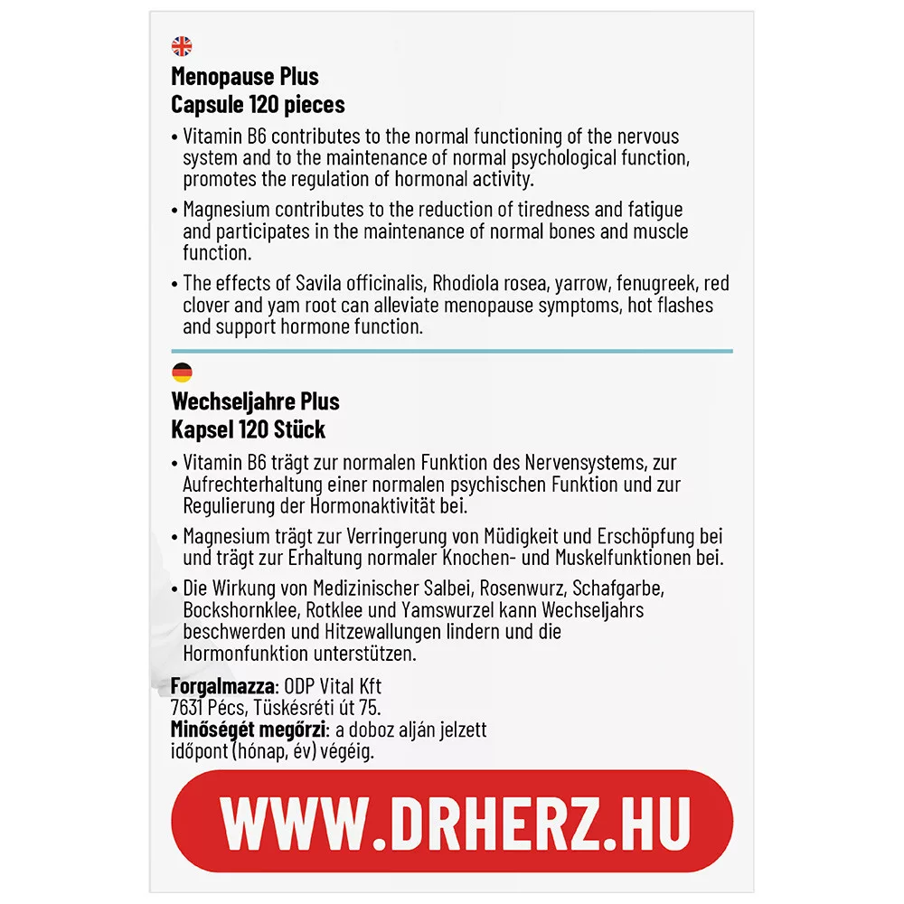 Összetétel: orvosi zsálya őrelmény por (salviae folium), magnézium-oxid, magnézium-laktát (magnézium), aranygyökér kivonat (rhodiola rosea), cickafark őrlemény por (achillea collina), görögszéna őrlemény por, vörös lóhere őrlemény por (trifolium pratense), yam gyökér kivonat (dioscorea villosa), piridoxin-hidroklorid (B6-vitamin) ,tömegnövelő szer (rizskeményítő), csomósodást gátló anyag (mikrokristályos cellulóz), kapszulahéj hidroxipropil-metil-cellulóz