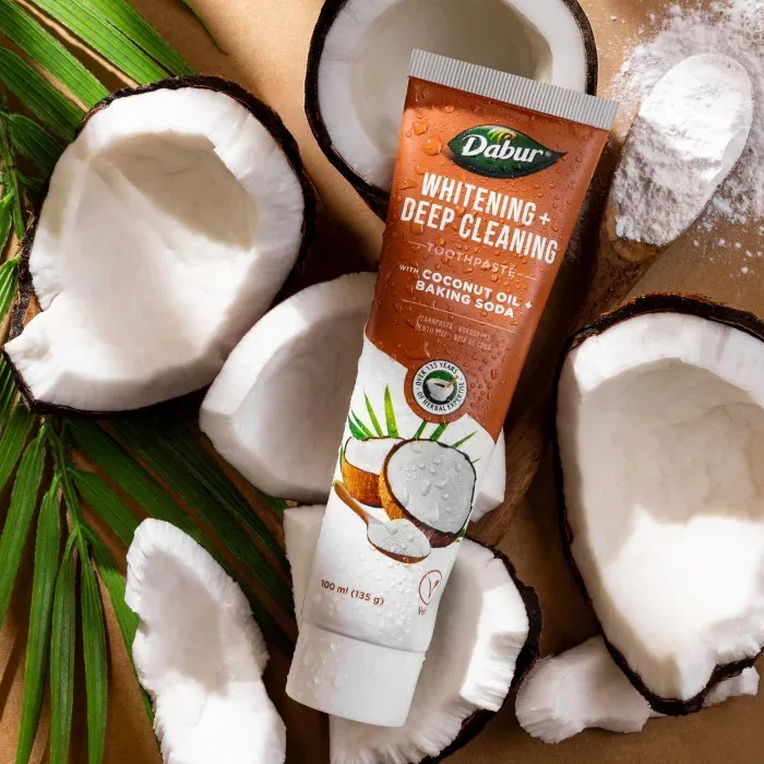 A kókuszolajjal és szódabikarbónával gazdagított fehérítő és mélytisztító hatású Dabur Coconut Oil Baking Soda Whitening & Deep Cleaning fluoridmentes fogkrém a kókuszolaj antibakteriális és mélytisztító hatásával segíti a friss lehelet mellett a hosszantartó tisztaság elérését. A szódabikarbóna pedig kíméletesen, mégis hatékonyan segít a zománcon lévő felületi foltok eltávolításában, természetesen fehérítve a fogakat. Emellett segít továbbá semlegesíteni a száj savas kémhatását, támogatva a fogszuvasodás kialakulásának megelőzését.