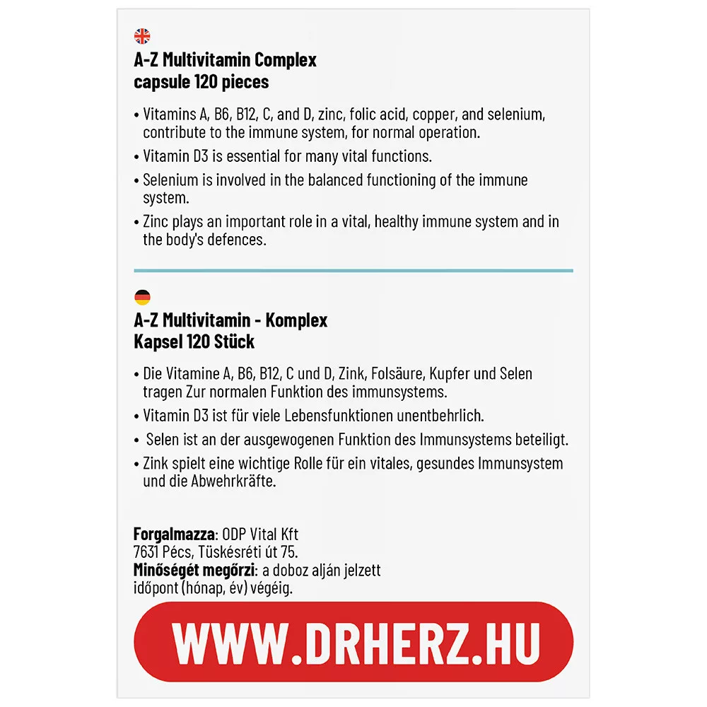 Összetevők: L-aszkorbinsav, magnézium-oxid, kalcium-oxid, kálium-klorid, nikotinamid, D-alfa-tokoferol, cink-citrát, kalcium-D-pantotenát, vas-fumarát, piridoxin-hidroklorid, riboflavin, tiamin-hidroklorid, réz-glükonát, béta-karotin (A-vitamin), folsav, (pteroilmonoglutaminsav, kalcium-L-metil-folát) biotin, kálium-jodát, menakinon,kró,-pikolinát, nátrium-molibdát, szelénnel dósított élesztő, kolekalciferol, cianokobalamin, tömegnövelő szer (kukoricakeményítő), csomósodást gátló anyag ( mikrokristályos cellulóz), kapszulahéj hidroxipropil-metil-cellulóz