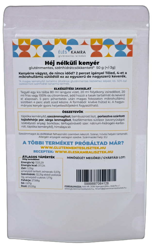 Elkészítési javaslat: tegyél egy kis tálba 80 ml langyos vizet, 20 ml folyékony zsiradékot, 20 ml friss vagy 100%-os citromlevet, add hozzá a tasak tartalmát és keverd el alaposan. 5 perc pihentetés után magas fokozaton mikrohullámú sütőben 4 perc alatt süsd készre. A formából kivéve hűtsd ki. A hagyományos kenyér gyors helyettesítőjeként fogyasztható.
