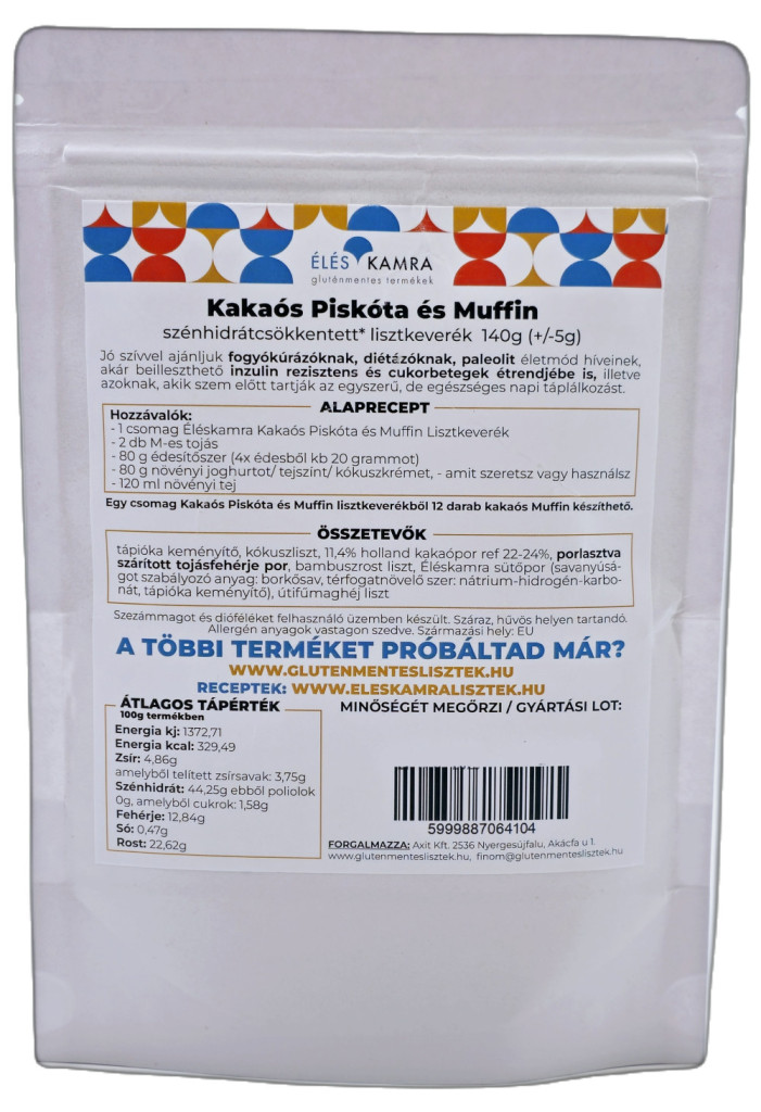 Összetevők: tápióka keményítő, kókuszliszt, 11,4% holland kakaópor ref 22-24%, porlasztva szárított tojásfehérje por, bambuszrost liszt, Éléskamra sütőpor (savanyúságot szabályozó anyag: borkősav, térfogatnövelő szer: nátrium-hidrogén-karbonát, tápióka keményítő), útifűmaghéj liszt