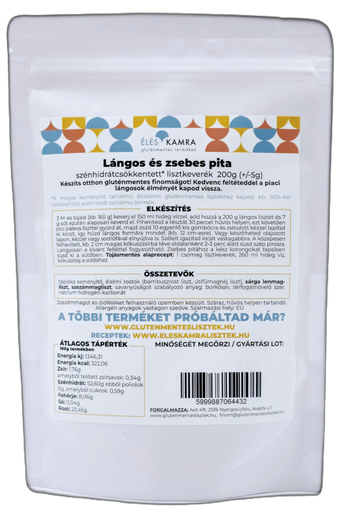 - 200 g Éléskamra Lángos és zsebes pita szénhidrát csökkentett* lisztkeverék