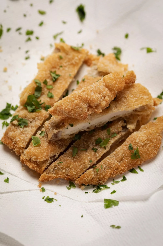 a sózott, borsozott húst gluténmentes lisztbe (pl. szezámliszt, mandulaliszt, tápióka liszt) forgatjuk, növényi tejbe mártjuk, majd megforgatjuk a ropogós panírmorzsában és zsiradékban készre sütjük (először pár perc alatt nagy fokozaton, majd mérsékelve). A hagyományos panírnál kicsit világosabbra sül. Apróbb, finomabb szemcséhez kávédarálón őröld le kicsit