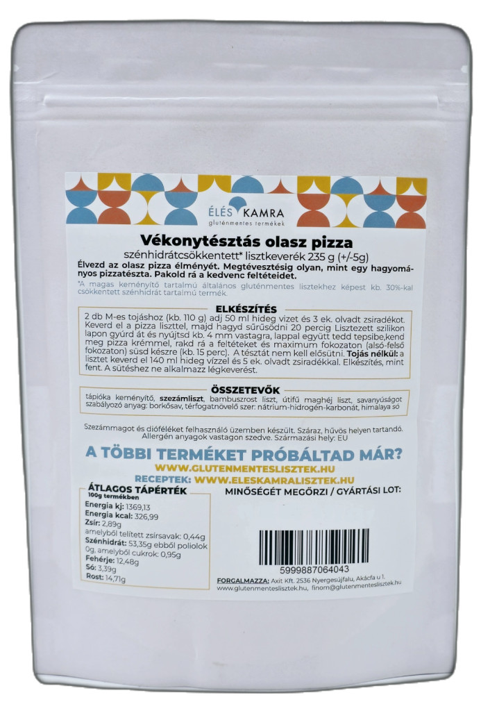 • 1 csomag Éléskamra Vékony tésztás olasz pizza szénhidrát csökkentett* lisztkeverék