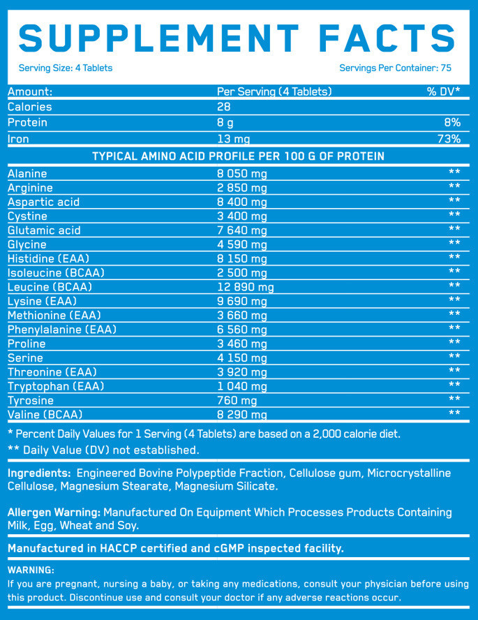 A Cryo Beef Amino tiszta, peptidkötésű aminosavakat tartalmaz, amelyeket steril marha-vörösvértestekből nyernek ki hidrolízissel és kétfokozatú szárítással. Ez a forradalmi technológia teszi lehetővé a finomítási folyamatot, amivel hozzáférhető a magas vastartalom, ezzel biztosítva stabil és megbízható formulát a felhasználók részére. Az eritrociták vörösvérsejtekként is ismertek. Ezek tartalmazzák a hemoglobint, mely vastartalma felelős az oxigénszállításért a tüdőből az izmokba és a test többi szövetébe. A marha eritrociták aminosavprofilja értékesebb az izomnövekedés szempontjából, mint a marhahús -, a tejsavó - és a gabonaprotein. Ez főként a magas BCAA tartalmának köszönhető (leucin, valin és izoleucin). Ezek az aminosavak a legfontosabbak építőkövei az izomszövetnek. Az esszenciális aminosavak szintje is magas a Cryo Beef profiljában. Ezeket az aminosavakat a szervezeted képtelen előállítani, ezért kell őket élelmiszerből vagy kiegészítőkből a szervezetedbe juttatni. Minden adag 8 g optimálisan kiegyensúlyozott aminosavat tartalmaz. A kis, 1000 U-s (U=molekulatömeg) molekulatömegüknek köszönhetően rendkívül gyorsan felszívódnak. Csak összehasonlítás céljából a kazein fehérje tömege 300 000 U, a tejsavóprotein pedig 60 000 U. Éppen ezért a Cryo Beef Amino lebontás nélkül, rögtön belép a véráramba, és az izomsejteket a felszívódás után (PLASMA INFUSION ™) rövid idő alatt eléri. A Cryo Beef Amino edzés előtti fogyasztása erős antikatabolikus hatása révén megakadályozza, hogy az izomszövet károsodjon a fizikai aktivitás során. Edzés utáni fogyasztása számos regenerációs folyamatot indít el, és magas leucin tartalmának köszönhetően növeli a fehérjék szintézisét. Az izomnövekedés további stimulálására újabb adagot lehet elalvás előtt is fogyasztani. Egy adag = 4 tabletta Használati utasítás: 4 tabletta edzés elött és 4 tabletta edzés után. Ezen felül 4 tabletta alvás előtt. Pihenőnapon 4 tabletta reggel és 4 tabletta alvás előtt. Csomag tartalma: 75 adag Összetevők: szarvasmarha-polipeptid frakció, cellulózgumi, mikrokristályos cellulóz, magnézium-sztearát, magnézium-szilikát