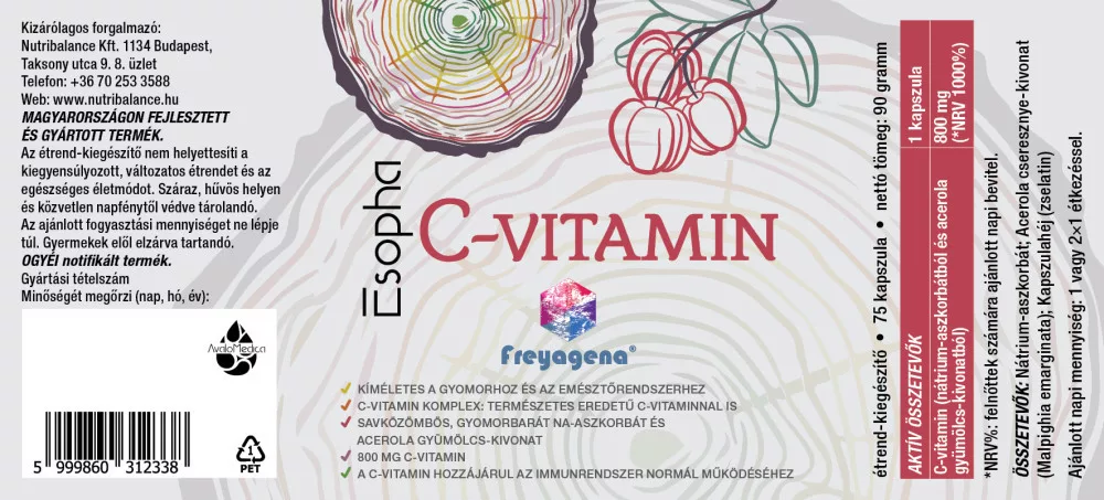 Egy kapszula (mely kibontható, így akár felezhető, harmadolható is) 800 mg C-vitamint tartalmaz savközömbös nátrium-aszkorbát és C-vitaminra standardizált Acerola-kivonat (Malpighia punicifolia) formájában. A Freyagena Esopha C-vitamin így kiválóan alkalmas antioxidáns védelemre anélkül, hogy gyomorégést (GERD, röviden reflux) okozna, azaz gyomorkímélő, gyomorbarát.