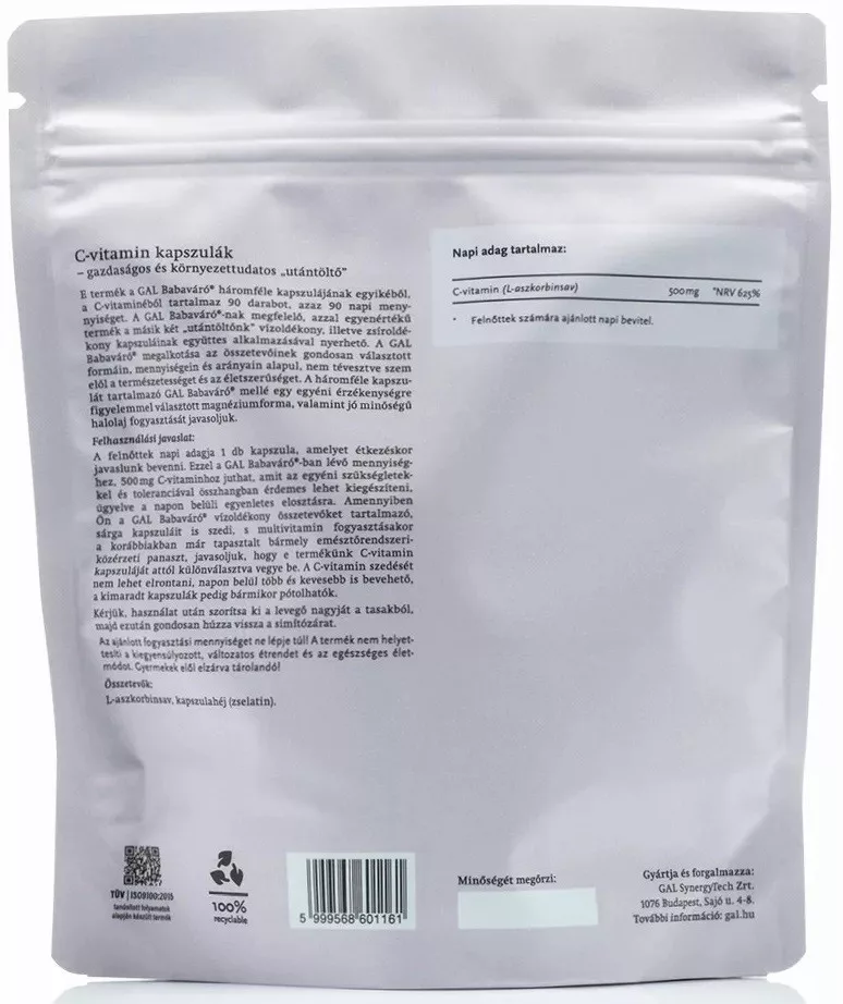 Napi adag: 1 db C-vitamin kapszula (fehér) + 1 db Lipofil olajkapszula (barna) + 2 db Hidrofil porkapszula (sárga).