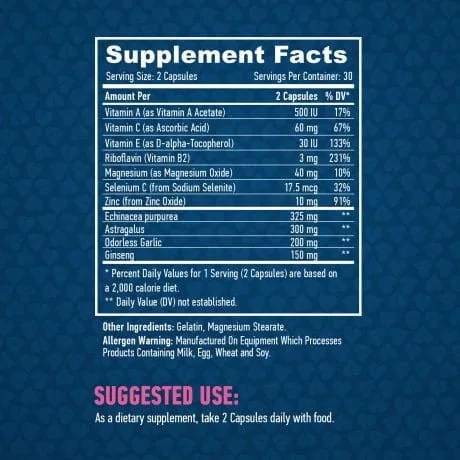 A Haya Labs 100% Immunity Formula 60 kapszulát, 500 NE A-vitamint, 60 mg C-vitamint, 30 NE E-vitamint, 3 mg riboflavint, 40 mg magnéziumot, 17,5 mcg szelént, 10 mg cinket, 325 NE A-vitamint, 325 NE 325 milligramm E-vitamint tartalmaz Szagtalan fokhagyma, 150 mg ginzeng adagonként. Az ajánlott adag 2 kapszula, naponta egyszer.