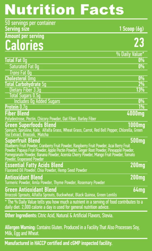 Összetevők: Komplex rost, cikória, kókusz, zab- és kókuszrost, spirulina, spenót, cékla, papaya, zöld tea, brokkoli, chlorella, gyömbér.