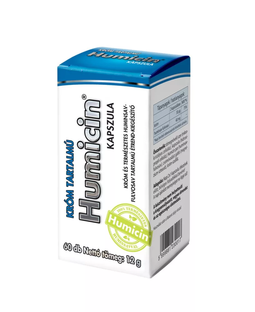 Krómtartalmú Humicin@ kapszula természetes huminsav tartalma kelátképző tulajdonsága révén elősegíti a hozzáadott króm hasznosulását, jobb beépülését a szervezetbe. A kelátképző molekulák ,megfogják" a fémionokat, ily módon megmentik a tápcsatornában jelen lévő savaktól, enzimektől, a táplálékban található egyéb anyagoktól, melyek hatására csak alig. vagy egyáltalán nem szívódnának fel.