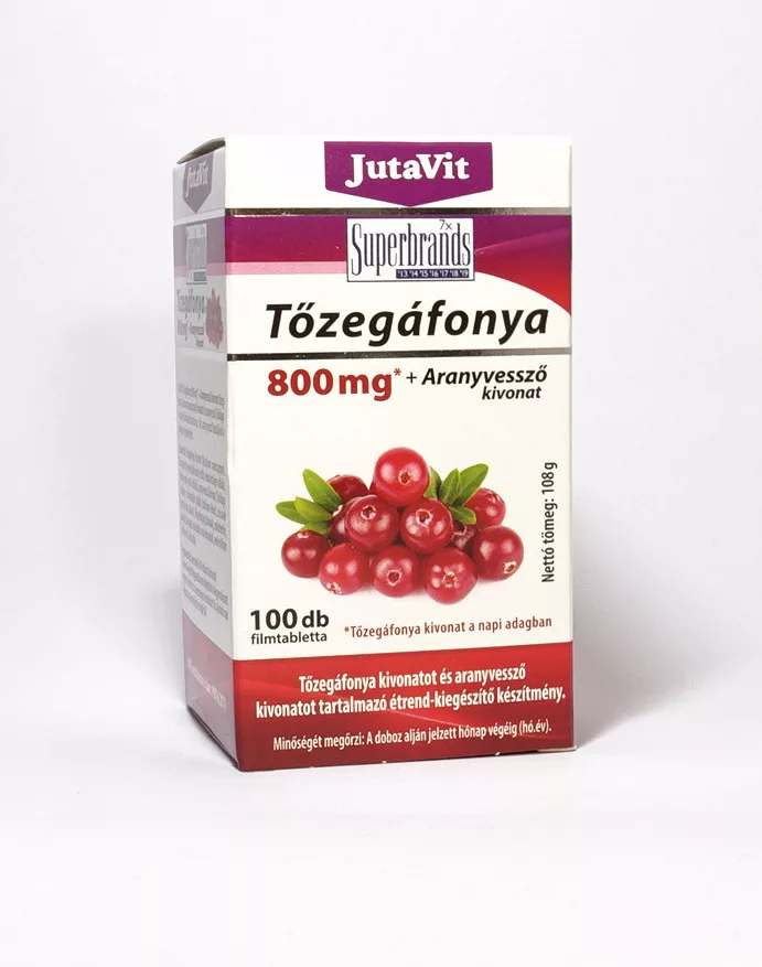 A JutaVit Tőzegáfonya 800mg*+Aranyvessző kivonat Tőzegáfonya (Vaccinium Macrocarpon) kivonatot és aranyvessző (Solidago Virgaurea) kivonatot tartalmazó étrend-kiegészítő.