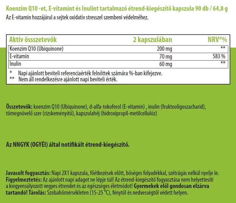 A Q10 a szervezetünkben előforduló természetes antioxidáns koenzim. Mennyisége az életkor előrehaladtával folyamatosan csökken, ezért kiegyensúlyozott beviteléről gondoskodni kell. A megfelelő Q10 ellátottság hozzájárul a szív egészséges működéséhez, a normális vérnyomás fenntartásához, a sejtszintű energiatermelő folyamatokhoz. Antioxidáns tulajdonságai révén védi a sejteket az öregedést okozó oxidatív stressz ellen.