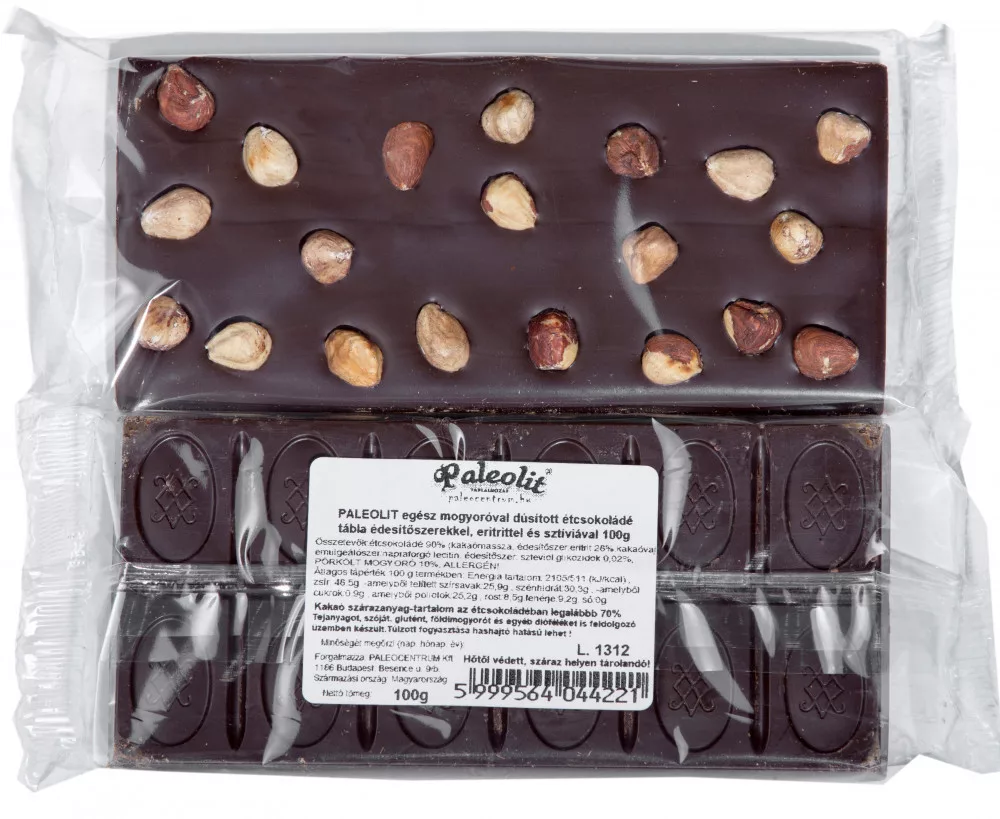 Összetevők: étcsokoládé (kakaómassza, édesítőszer: eritrit (28%), kakaóvaj, emulgeálószer: napraforgó lecitin, édesítőszer: szteviol glikozidok (0,02%)) pörkölt mogyoró 10% Kakaó szárazanyag legalább 70%.