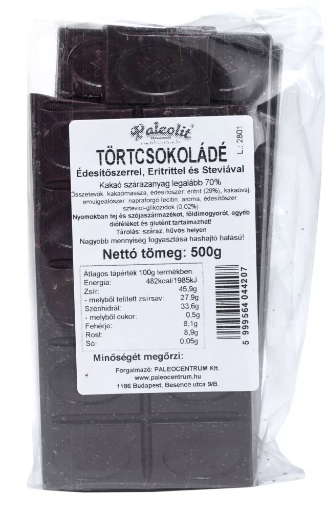 Összetevők: kakaómassza, édesítőszer: eritrit, kakaóvaj, emulgeálószer: napraforgó lecitin, aroma, édesítőszer: szteviol glikozidok. Kakaó szárazanyag legalább 70%.