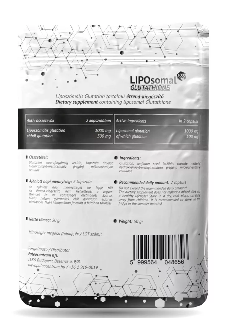 Összetevők: L-glutation (GSH), napraforgómag lecitin, kapszula anyaga vegán HPMC (hidroxopropil-metilcellulóz), mikrokristályos cellulóz