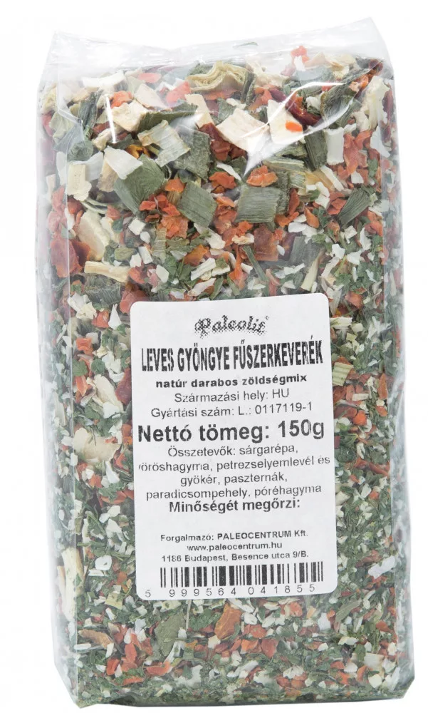 Összetevők: sárgarépa, vöröshagyma, petrezselyemlevél és gyökér, paszternák, paradicsompehely, póréhagyma