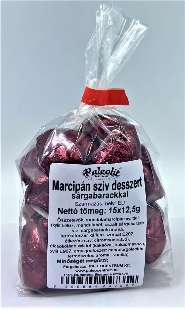 Összetevők: mandulamarcipán xylittel (xylit E967, mandulabél, aszalt sárgabarack, víz, sárgabarack aroma, tartósítószer kálium-szorbát E202,