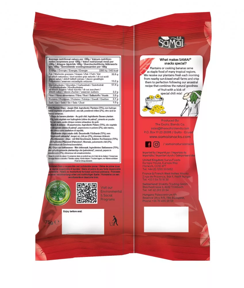 A SAMAI Plantain chips prémium minőségű főzőbanánból készül, melyet Dél-Amerika csendes-óceáni partján, Ecuadorban helyi farmerek termesztenek.