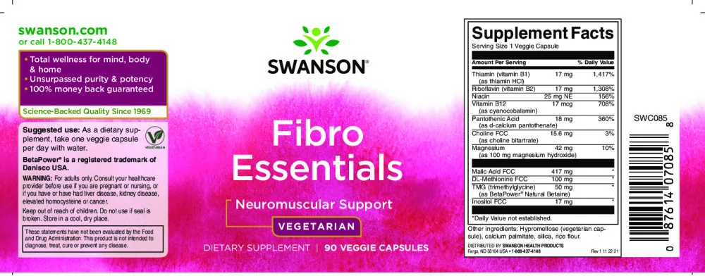 A Swanson Fibro Essentials egy különleges komplex formula,? amely segíthet enyhíteni a fibromyalgia tüneteit. Tartalmaz? almasavat, magnéziumot, metionint, trimetilglicint (TMG-t) és B? vitaminokat, amelyek fontosak az izmok egészségének és? az idegrendszer működésének támogatásában. Könnyen lenyelhető növényi kapszulák formájában kapható, amelyeket naponta egyszer kell bevenni.