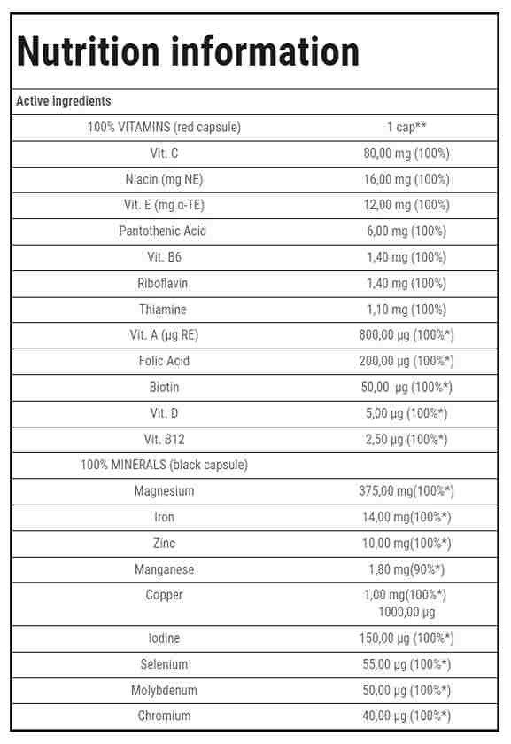 A 100% VITAMINS & MINERALS egy termék, amely 2 kapszulából áll: 100% VITAMINOK (piros nappali kapszula) és 100% MINERALS (fekete éjszakai kapszula). A termék esszenciális B-vitaminokat tartalmaz, köztük tiamint, B6-vitamint, riboflavint és B12-vitamint, amelyek alapvető szerepet játszanak az energia-anyagcserében és támogatják az idegrendszer működését. A termék az immunrendszert erősítő A-, C- és D-vitamint, valamint a sejteket az oxidatív stressztől védő E-vitamint tartalmaz. A termékben található magnézium csökkenti a fáradtságot és a kimerültséget, míg a jód és a szelén gondoskodik a pajzsmirigy egészségéről. A termék a férfiak számára fontos ásványi anyag, a cink forrása, amely segít fenntartani a vér megfelelő tesztoszteronszintjét.