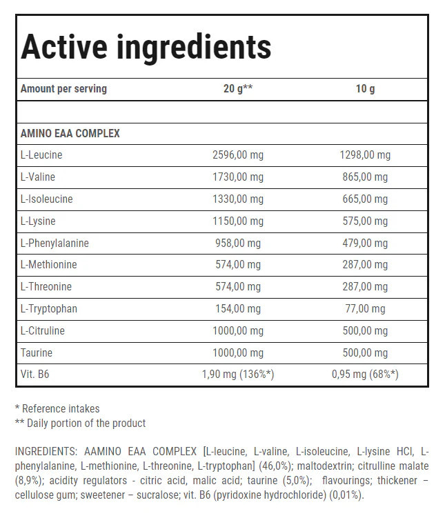 Az AMINO EAA-t úgy tervezték, hogy gyorsan helyreállítsa az aminosavszintet kemény edzés előtt és után. Az AMINO EAA optimális arányban tartalmazza az összes esszenciális aminosavat L-citrullin és taurin hozzáadásával. Az AMINO EAA emellett hozzájárul a normál energiatermelő anyagcseréhez, valamint a fáradtság és kifáradás csökkentéséhez.