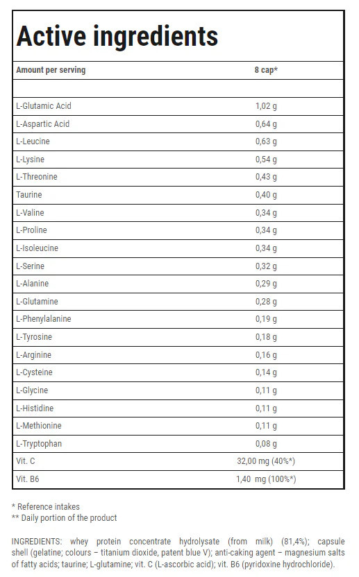 Az ajánlott napi bevitel 8 kapszula. Öblítse le 300 ml vízzel. Edzésnapokon: 8 kapszula közvetlenül az edzés után. Edzés nélküli napokon: naponta kétszer, alkalmanként 4 kapszula, 30 perc. étkezés előtt.