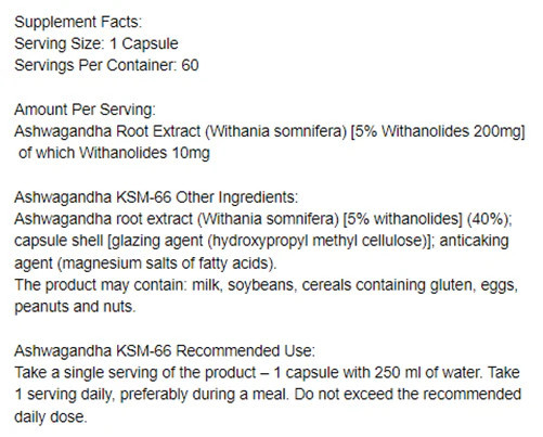 Ashwagandha gyökér kivonat KSM-66: 200 mg (Withania somnifera) [5% withanolides 10 mg] ; kapszulahéj (hidroxi-propil-metil-cellulóz); csomósodást gátló szerek (zsírsavak magnéziumsói). A termék a következőket tartalmazhatja: tej, szója, gluténtartalmú gabonafélék, tojás, földimogyoró és dió.