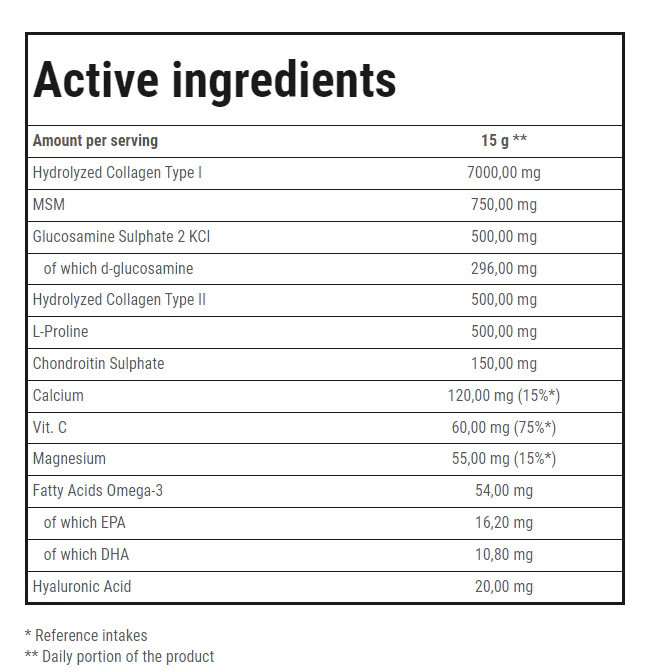 A FLEX GUARD egy komplex étrend-kiegészítő, amely kollagén-hidrolizátumot, MSM-et, glükózamint, L-prolint, Omega-3-at, kondroitint és hialuronsavat tartalmaz. A FLEX GUARD C-vitamint is tartalmaz, amely támogatja a megfelelő kollagéntermelést, hogy biztosítsa a porcok és a csontok megfelelő működését. A termék kalciumot és magnéziumot is tartalmaz – olyan ásványi anyagokat, amelyek nélkülözhetetlenek csontjai egészségének megőrzéséhez. A FLEX GUARD olyan megerőltető edzést követő sportolóknak ajánlott, akik gyakran vannak kitéve a túlterhelés és a sérülések kockázatának.