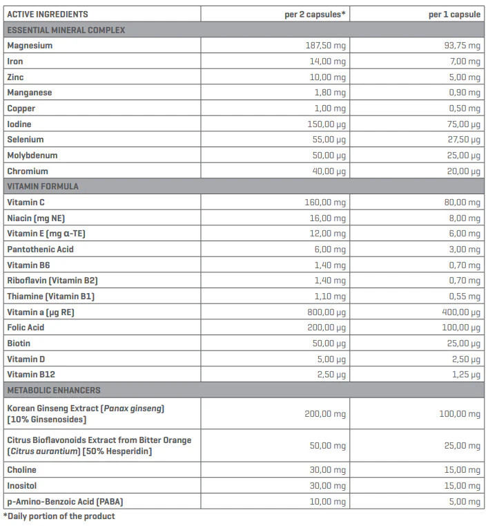 A Multipack vitaminok, ásványi anyagok és metabolikus aktivátorok komplex összetétele, amely tamogatást nyújt a nehéz fizikai vagy stresszes körülmények között. A stressz, a rosszul kiegyensúlyozott étkezés vagy az intenzív edzés hatására megnövekszik az erőnléthez és a vitalitáshoz kulcsfontosságú anyagok iránti igény. A Multipack napi étrend-kiegészítőként és könnyen felszívódó vitaminok és ásványi anyagok forrásaként ajánlott minden fizikailag vagy szellemileg aktív ember számára.