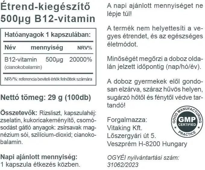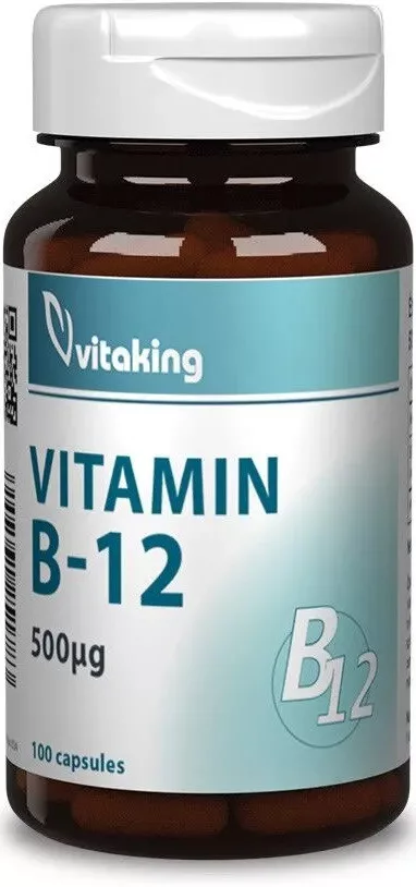 A Vitaking B-12 vitamin (500µg / kapszula) gazdaságos, 100 db-os kiszerelésben kapható.