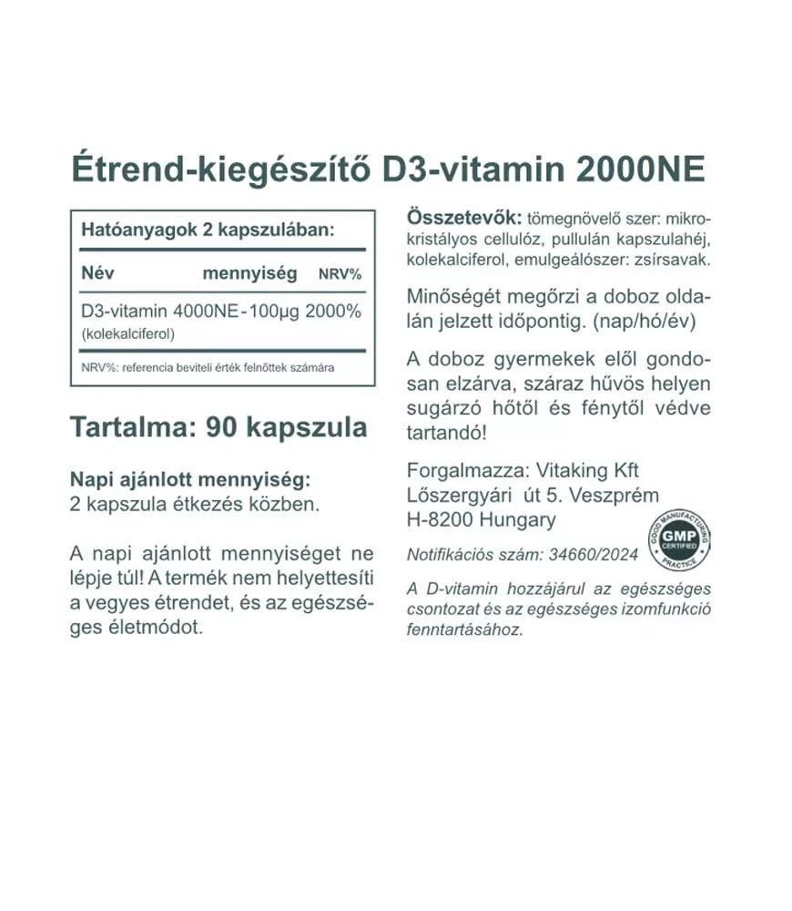2000NE hatóanyag-tartalmú D3 vitamin kapszula. A D-vitamin (D3-vitamin) zsírban oldódik, amely napsütéssel és megfelelő étkezéssel kerül a szervezetünkbe. A napfényvitaminnak is nevezett D-vitamin fontos szerepet játszik a csontok egészségében, a megfelelő izomműködésben és hozzájárul az immunrendszer normál működéséhez.