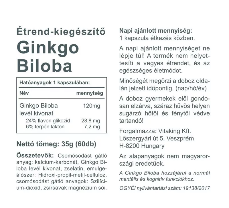 A Vitaking Ginkgo Biloba Fotre flavon glikozid tartalma 28.8 mg, és terpén lakton tartalma 7, 2 mg kapszulánként.