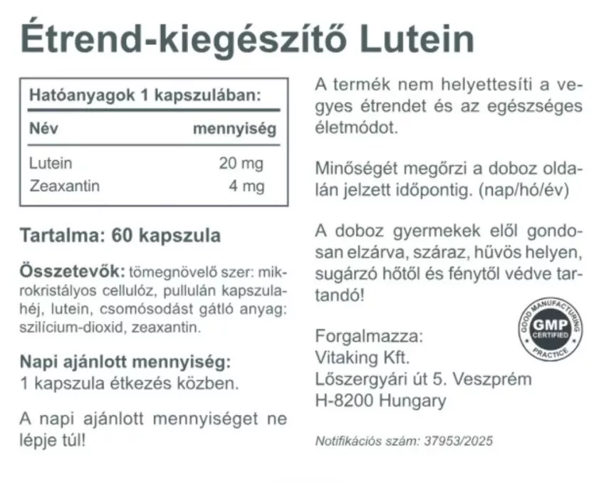 Összetevők: tömegnövelő szer: mikrokristályos cellulóz, pullulán kapszulahéj, lutein, csomósodást gátló anyag: szilícium-dioxid, zeaxantin.
