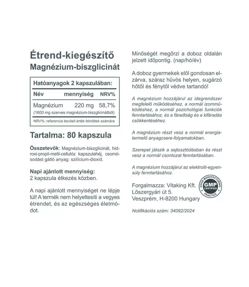Magnézium-biszglicinát, hidroxi-propil-metil-cellulóz kapszulahéj, csomósodást gátló anyag: szilícium-dioxid