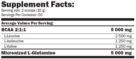A Glutamine + BCAA elágazó láncú aminosavakat tartalmaz, optimális arányban 2: 1: 1 és ugyanannyi mikronizált L-glutamint . Az L-glutamin a szervezetben a legelterjedtebb aminosav, amely a vázizomzat szabad aminosav-készletének több mint 60% -át, és az összes keringő aminosav 20% -át teszi ki. A BCAA aminosavak a fehérje építőkövei, amelyek hozzájárulnak az izomtömeg növekedéséhez és fenntartásához. Ezen esszenciális aminosavak (L-leucin, L-izoleucin, L-valin) kombinációja kb. az összes izomfehérje 33% -a. Előnyök: